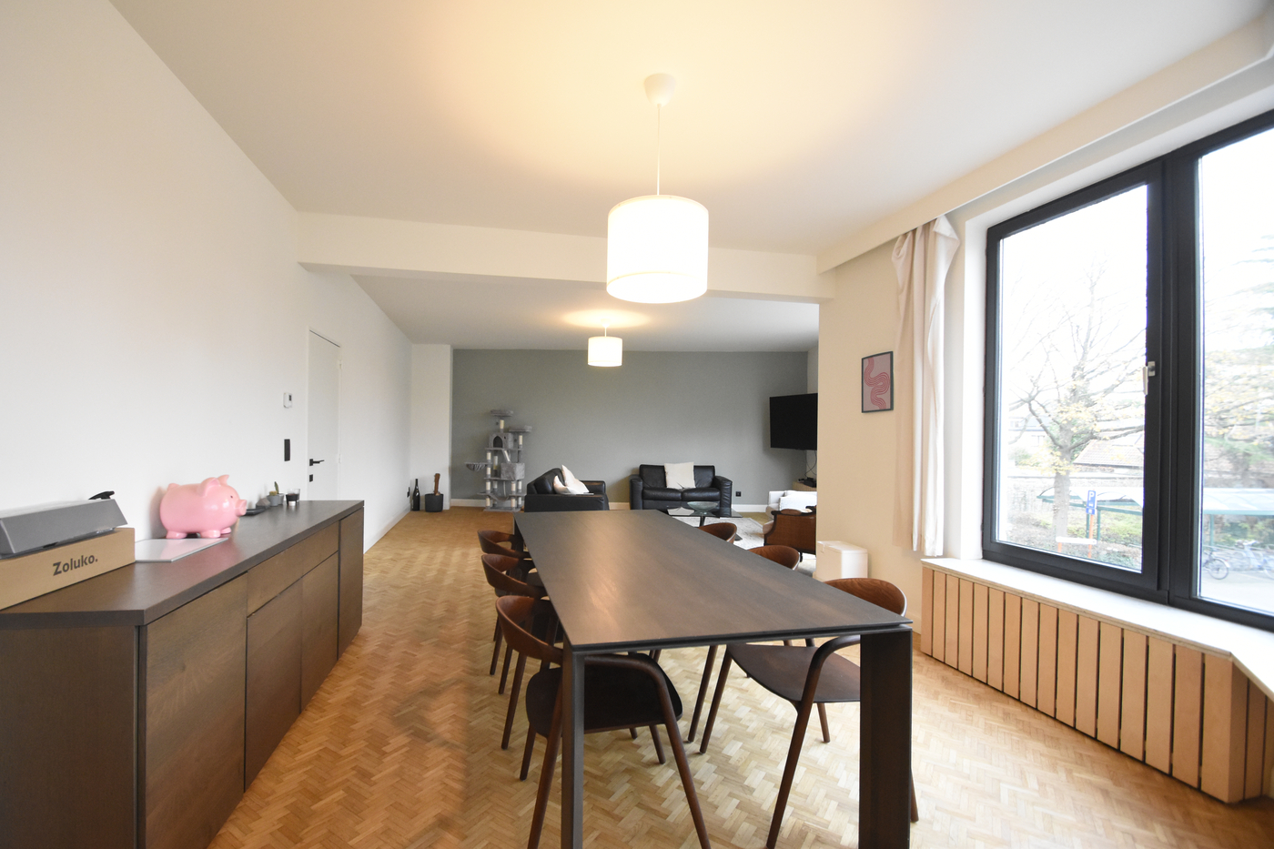 De leefruimte is voorzien van een prachtige parketvloer die meteen voor een gezellig gevoel zorgt. Dankzij de grote raampartijen geniet je hier van veel natuurlijke lichtinval.
