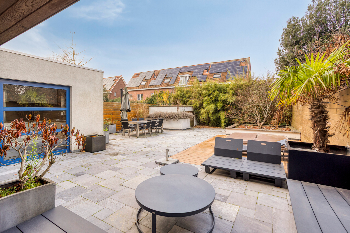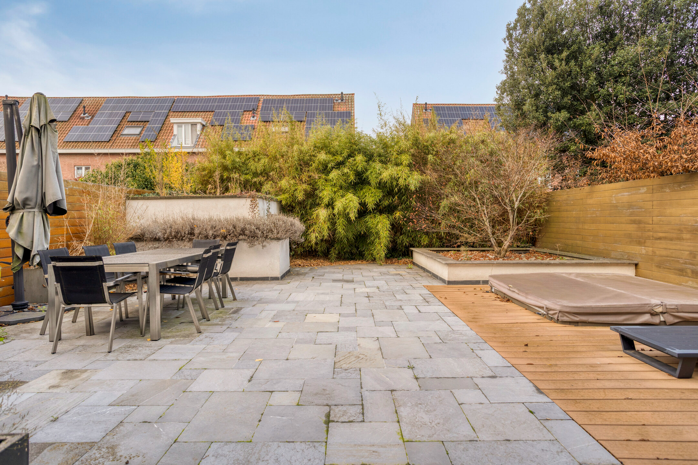 Buiten geniet je van een zonnig terras/tuin, volledig zuidwest gericht en uitgerust met een jacuzzi en fietsenberging.