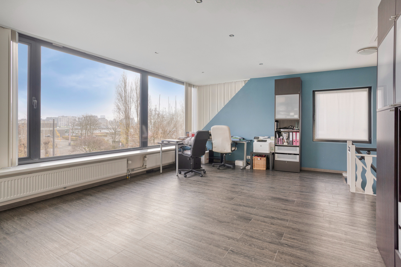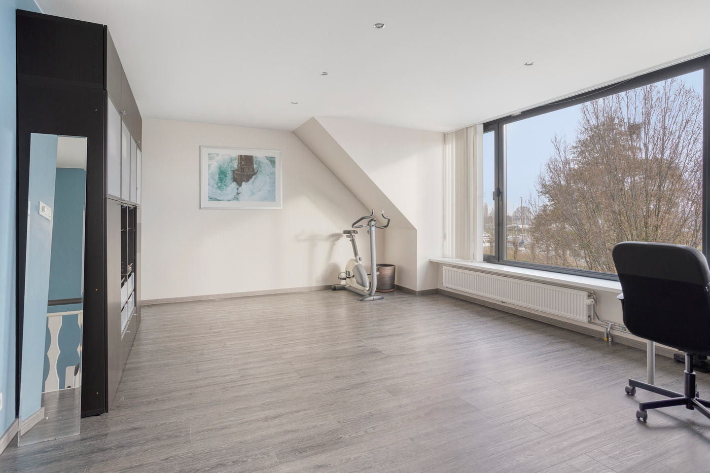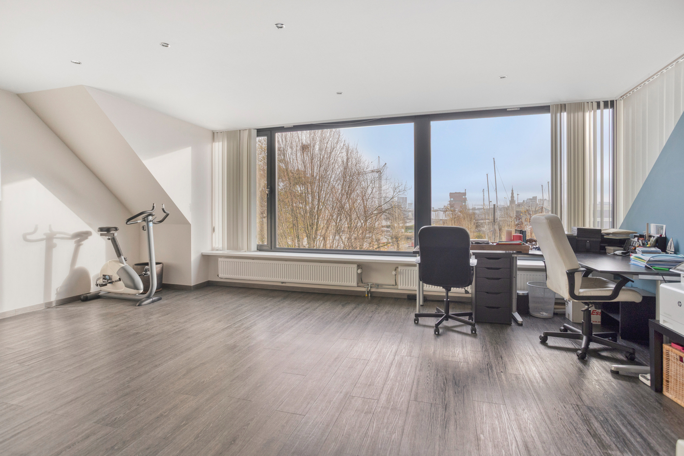 Eén daarvan is een uitzonderlijk ruime polyvalente kamer die, indien gewenst, nog kan worden opgedeeld en een prachtig uitzicht biedt over Antwerpen en de jachtclub.