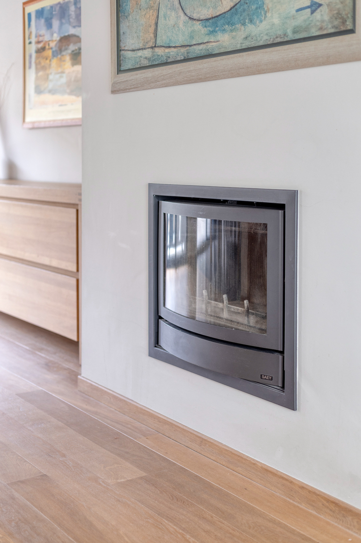 De ruime L-vormige woonkamer, met een inbouwhaard en gedeeltelijke parketvloer.