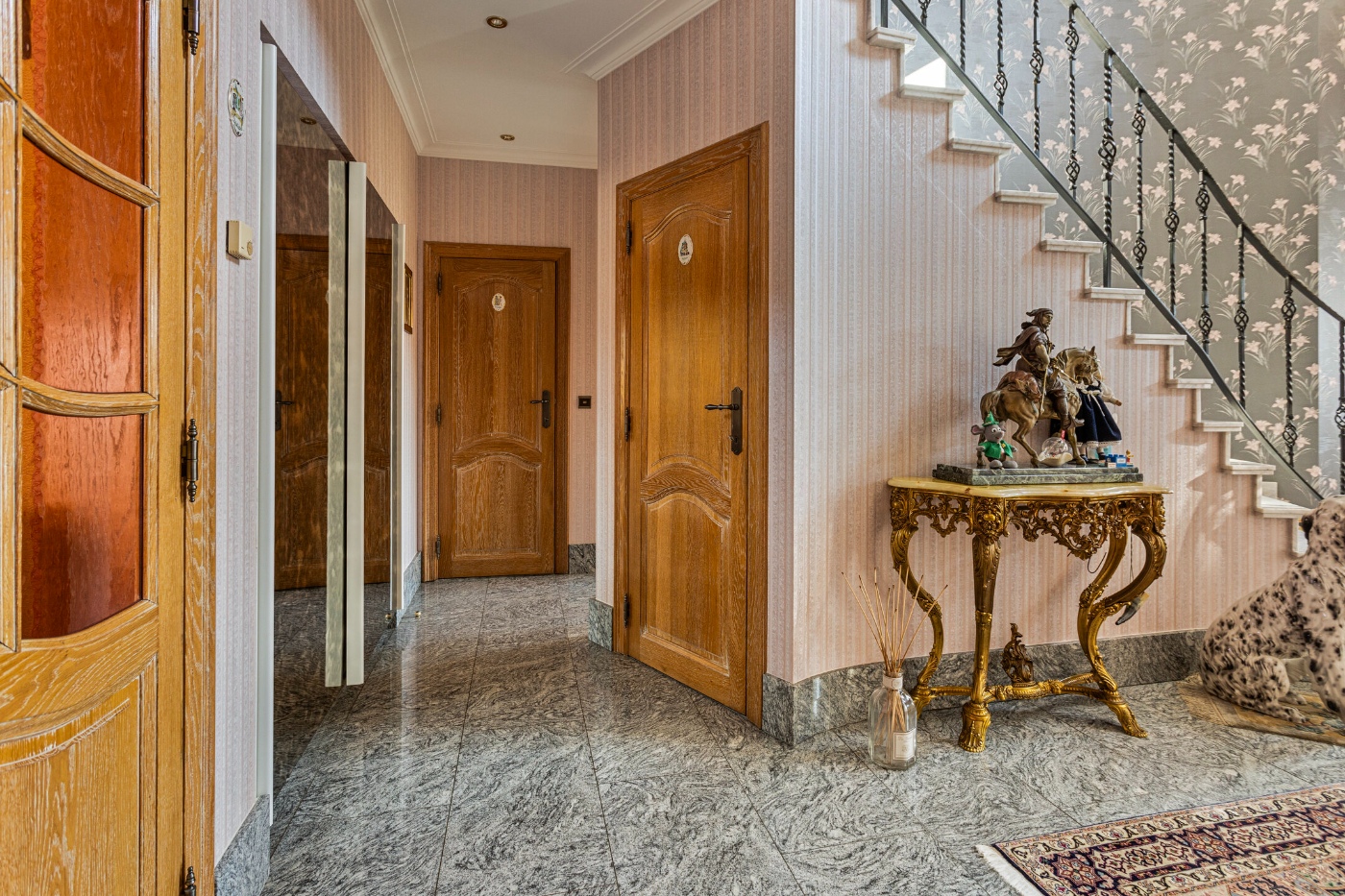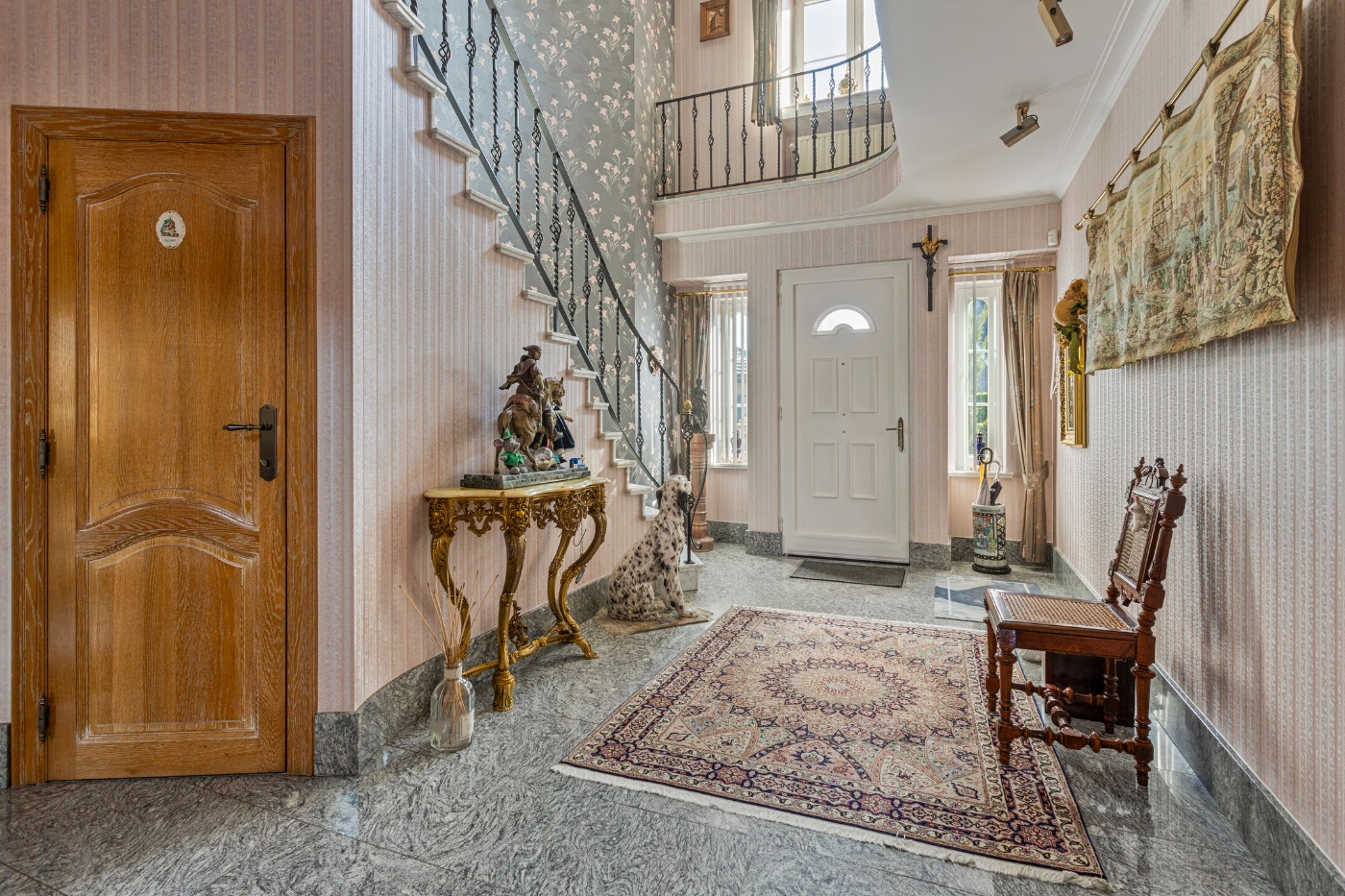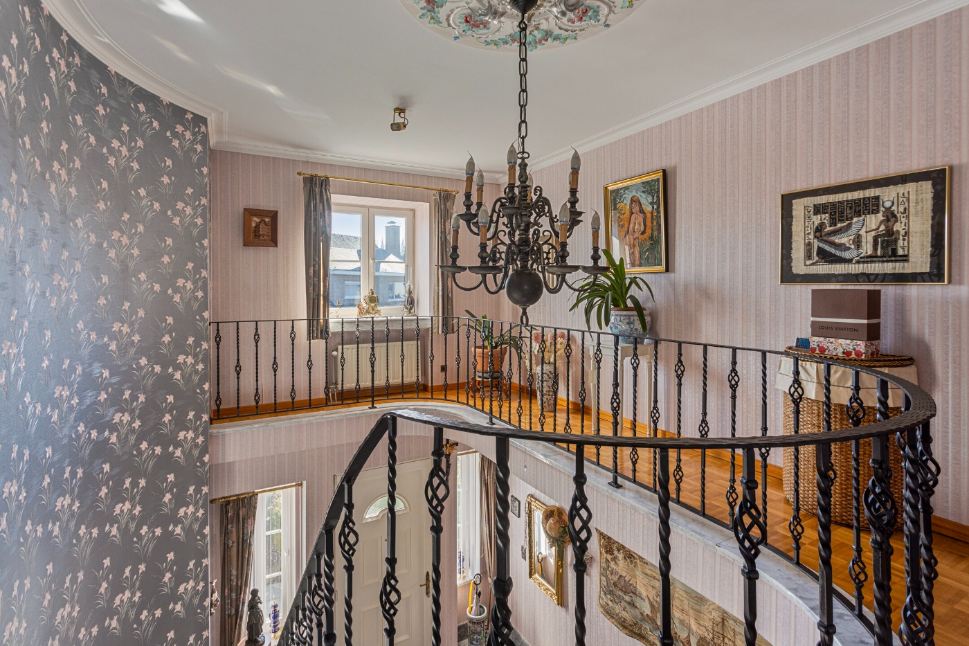 Bij binnenkomst in de imposante inkomhal word je meteen verwelkomd door een prachtige trap, die het statige karakter van de woning benadrukt.