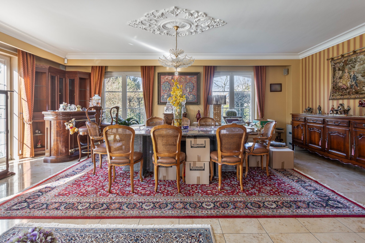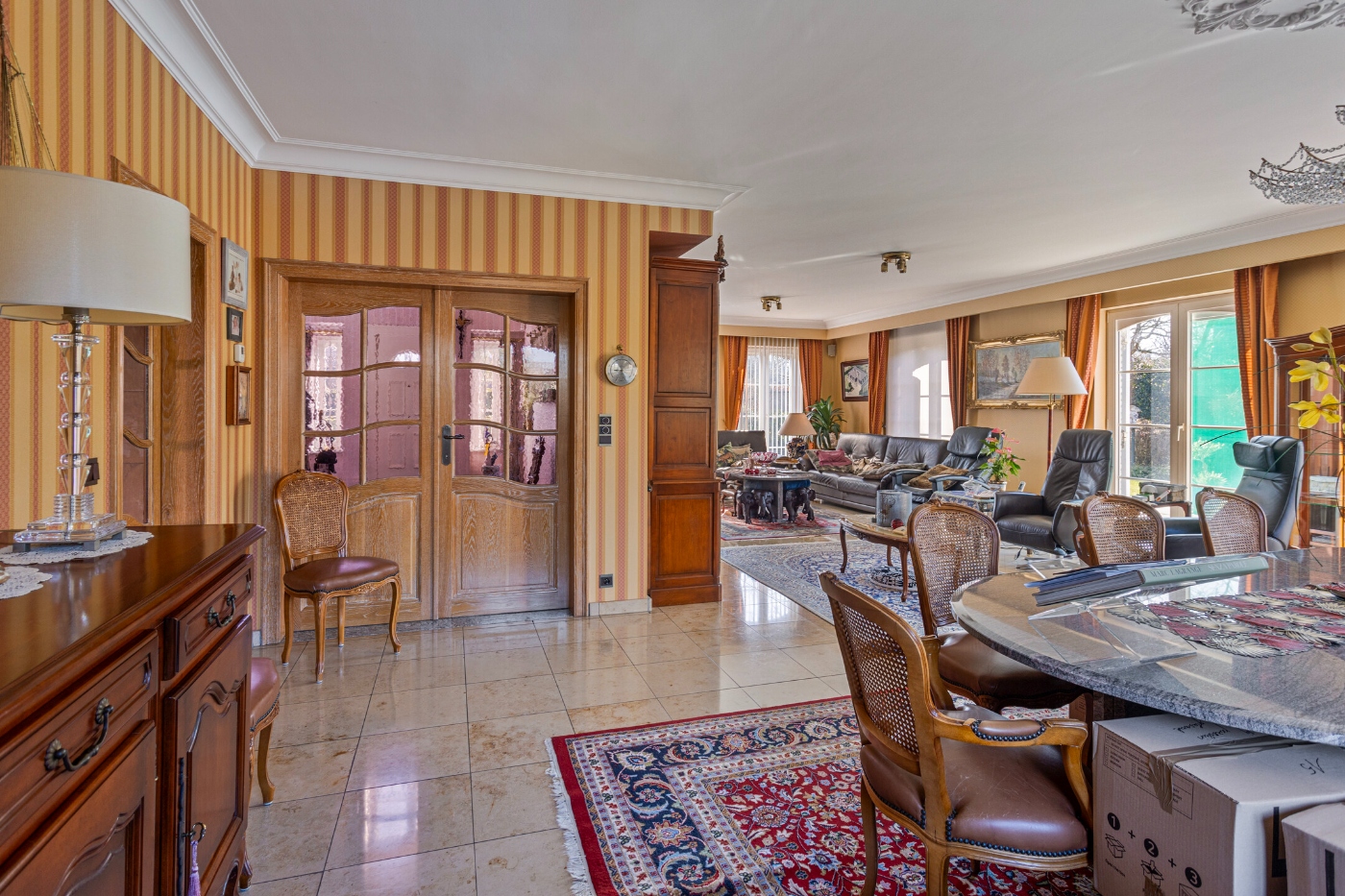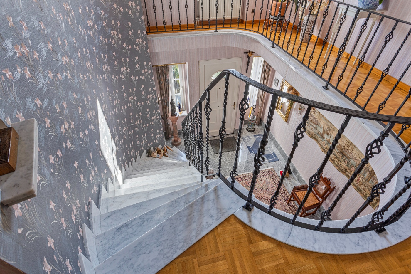 Bij binnenkomst in de imposante inkomhal word je meteen verwelkomd door een prachtige trap, die het statige karakter van de woning benadrukt.