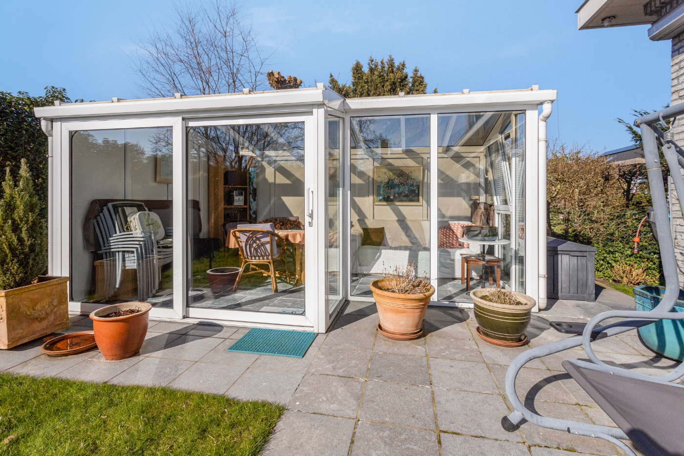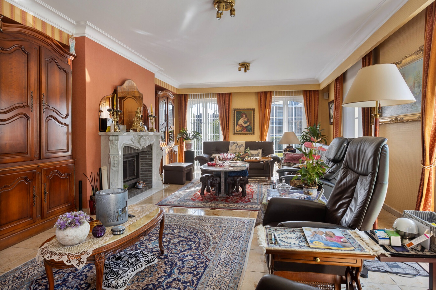 De lichtrijke leefruimte baadt in het zonlicht dankzij de vele raampartijen en biedt een gezellige inbouwhaard.