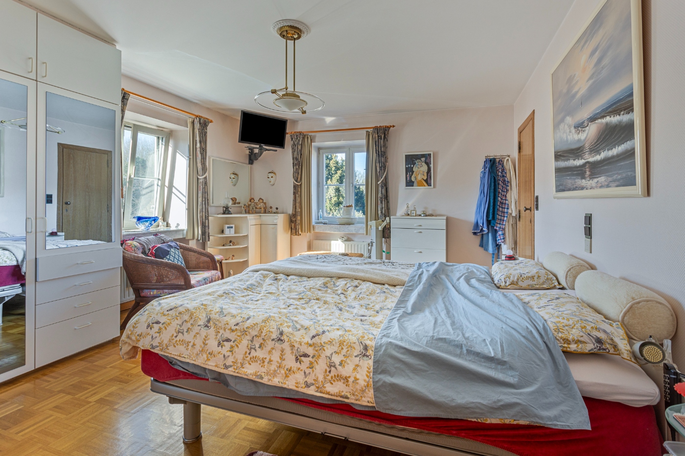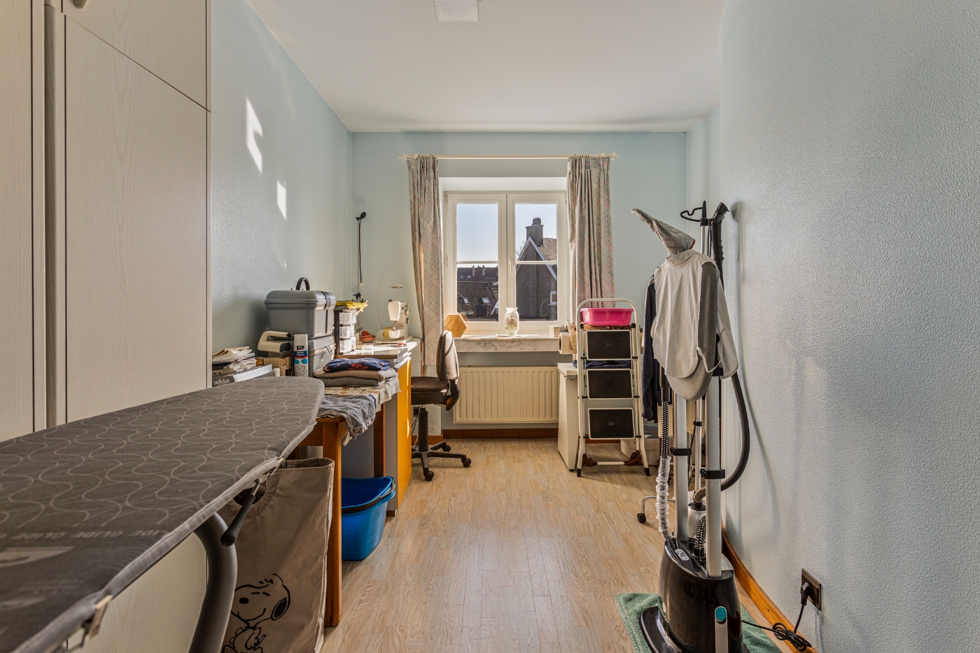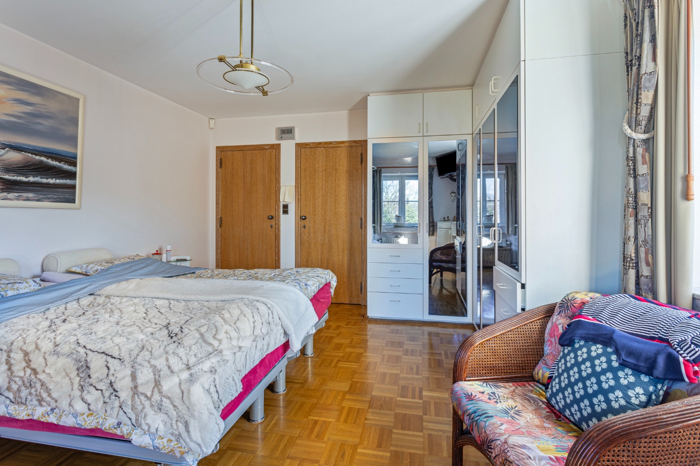 Op de eerste verdieping ontdekken we: masterbedroom (20m²) met dressing en en-suite badkamer, ruime logeerkamer (20m²), kinderkamer (14m²) met aparte douchekamer, strijkkamer en enorme polyvalente ruimte (45m²), perfect als hobbyruimte of extra slaapkamer. Vanuit deze ruimte is er toegang tot de zolder.