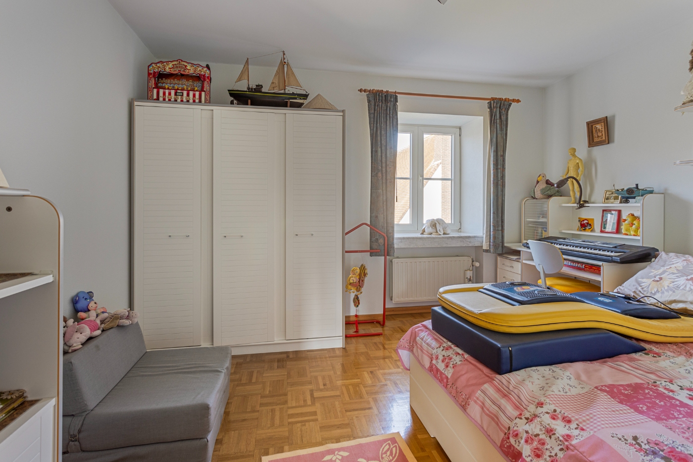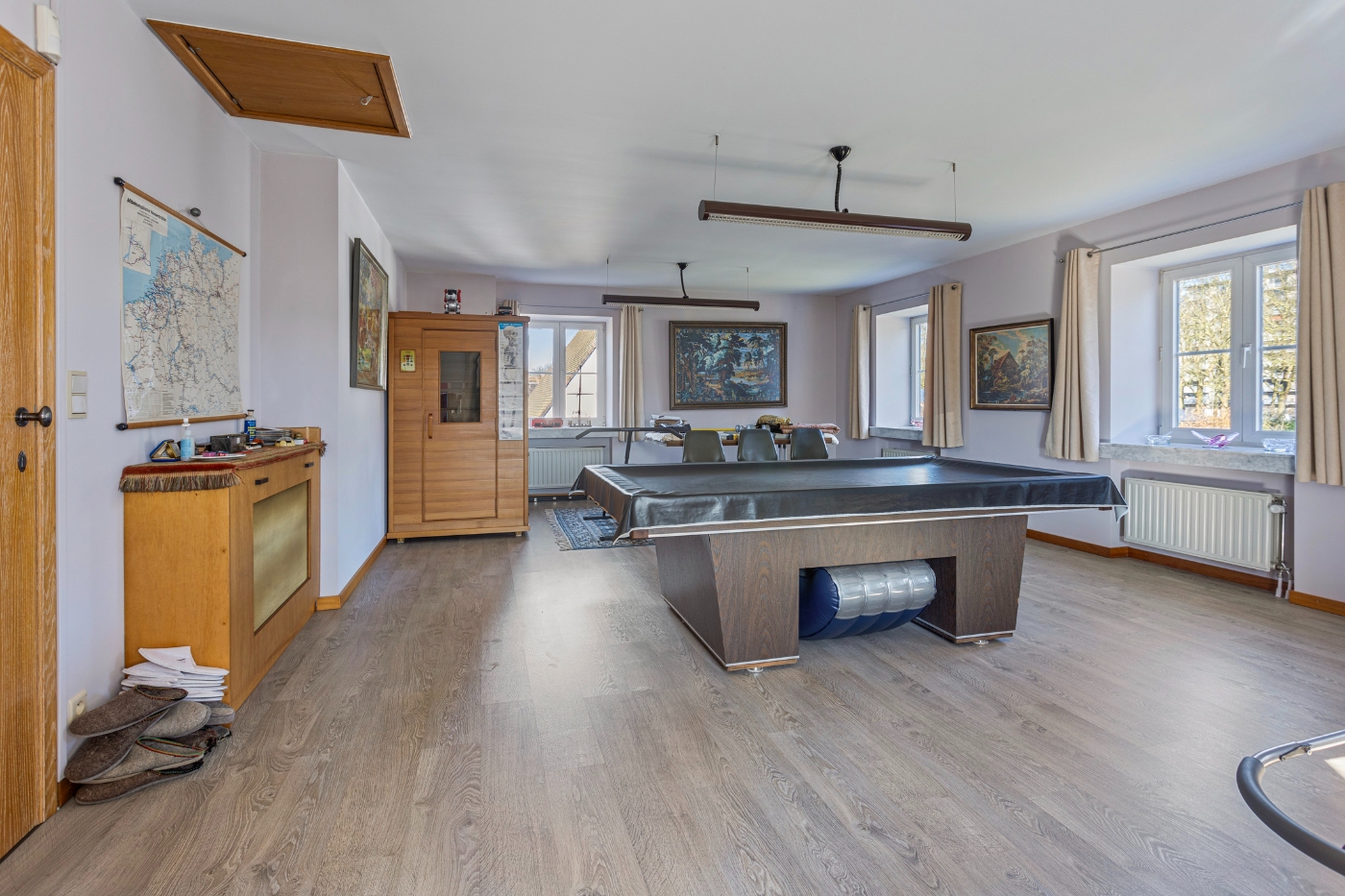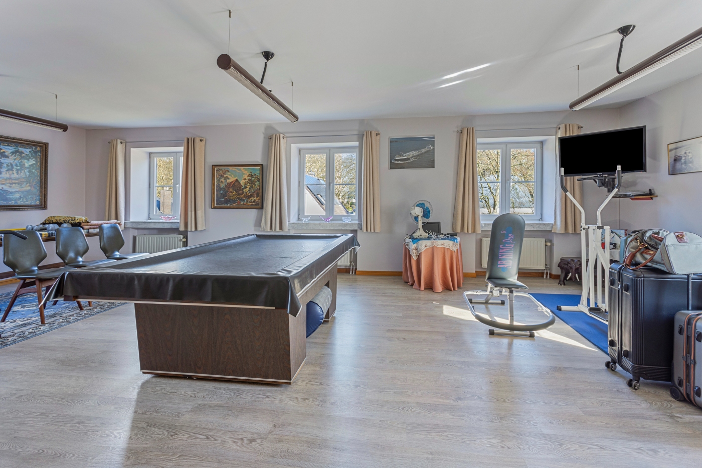 Op de eerste verdieping ontdekken we: masterbedroom (20m²) met dressing en en-suite badkamer, ruime logeerkamer (20m²), kinderkamer (14m²) met aparte douchekamer, strijkkamer en enorme polyvalente ruimte (45m²), perfect als hobbyruimte of extra slaapkamer. Vanuit deze ruimte is er toegang tot de zolder.