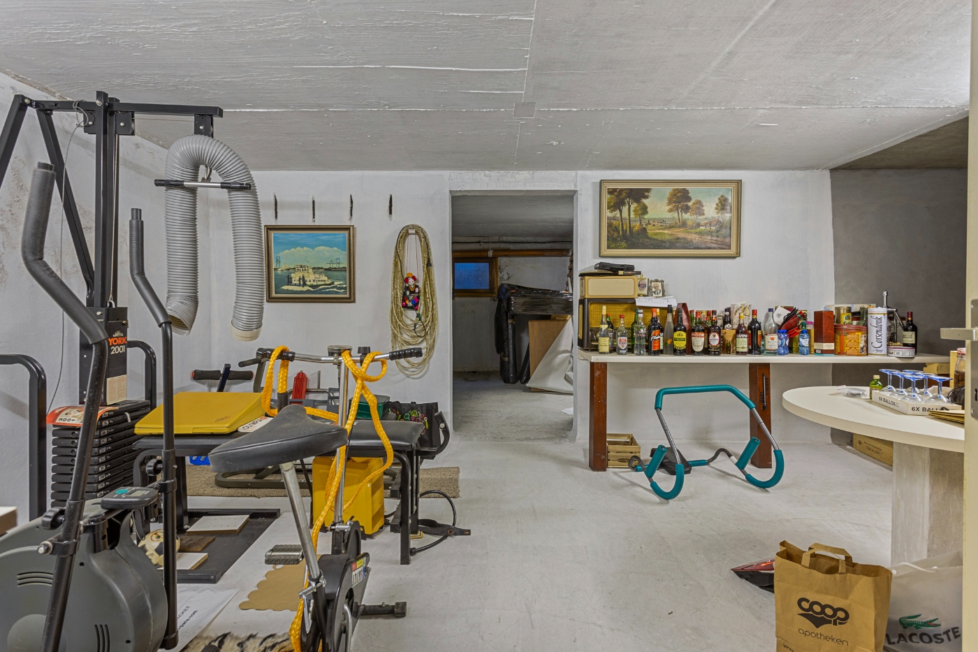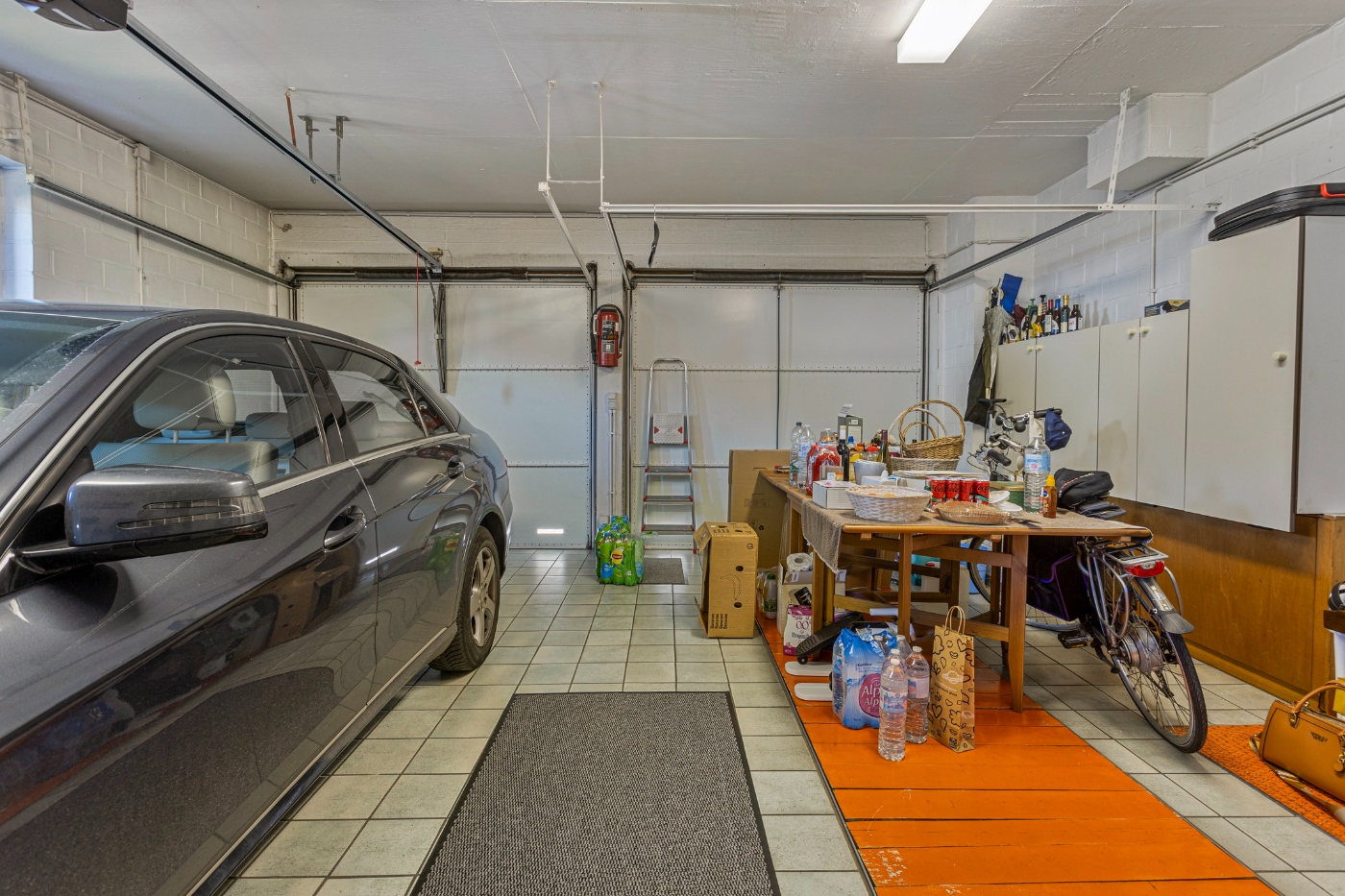 Verder op het gelijkvloers: grote inpandige garage voor twee wagens, wasplaats en douchekamer