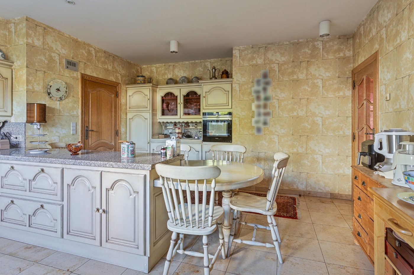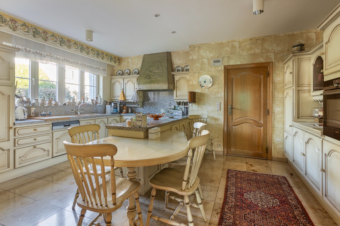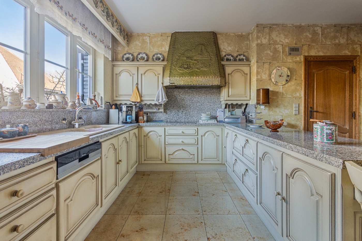 Aansluitend bevindt zich de keuken, die nog steeds de originele uitstraling heeft, maar met recent vernieuwde toestellen en voorzien van alle comfort.