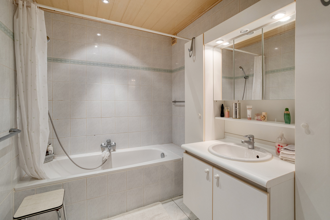 De betegelde badkamer is voorzien van een ligbad en een lavabomeubel met wastafel.