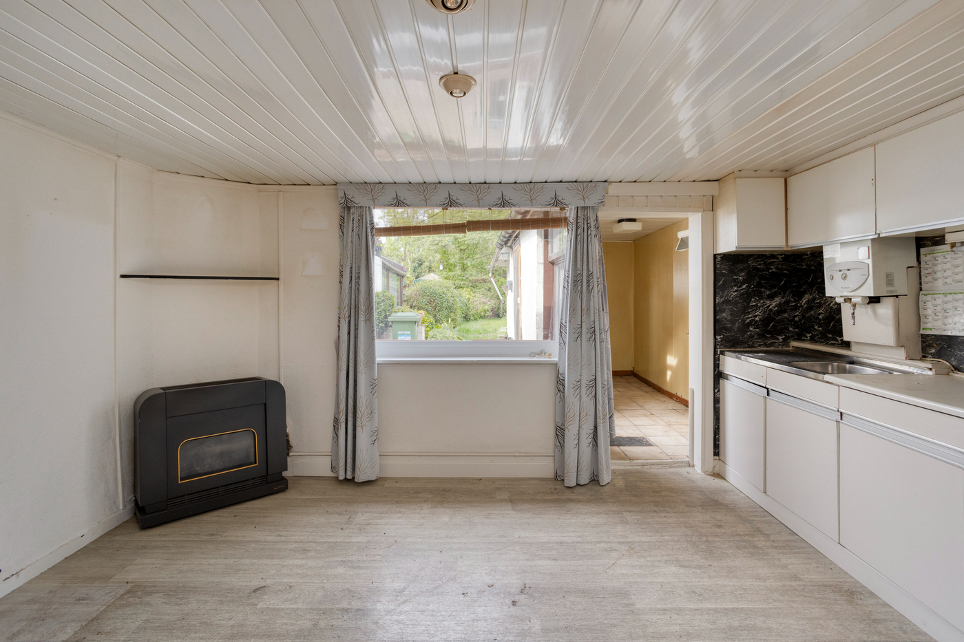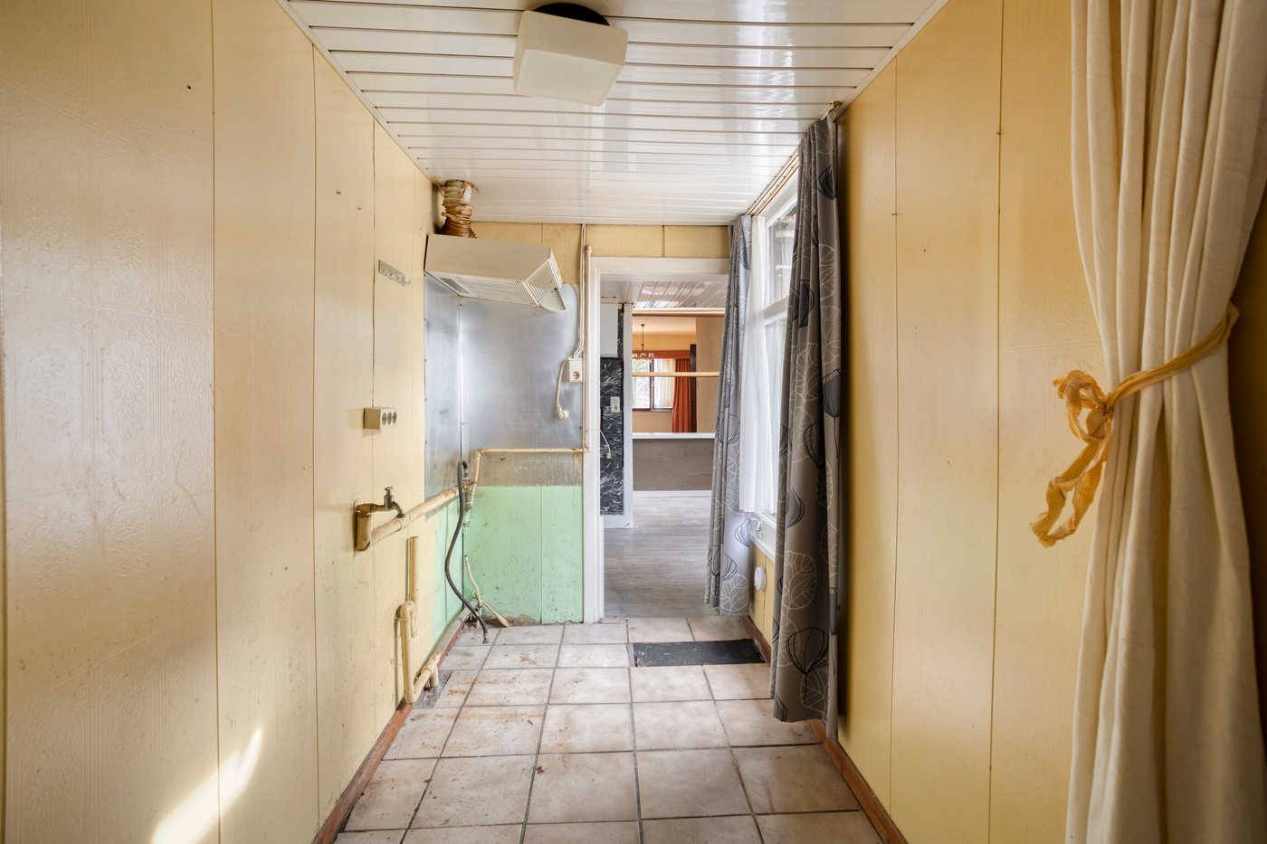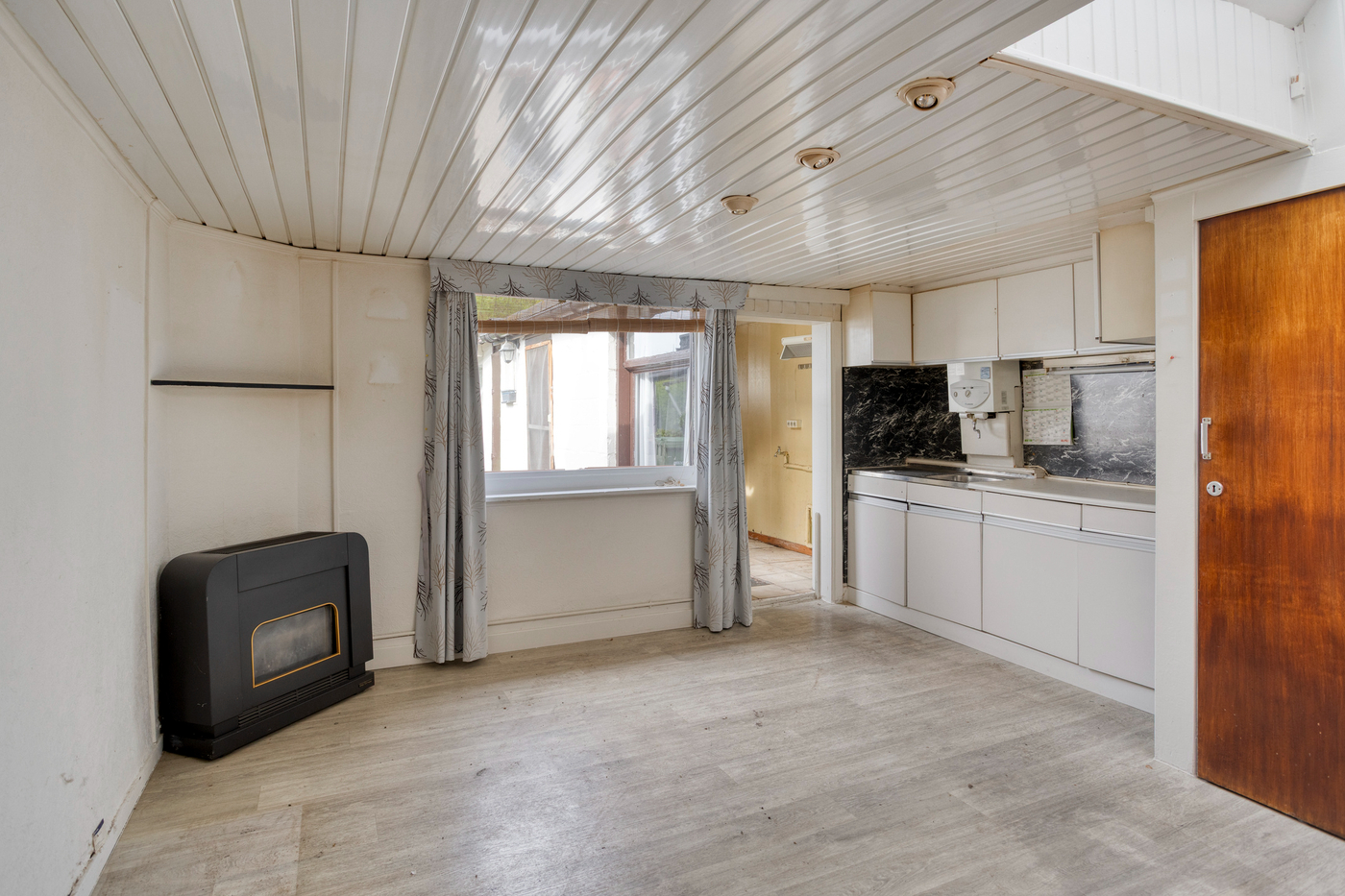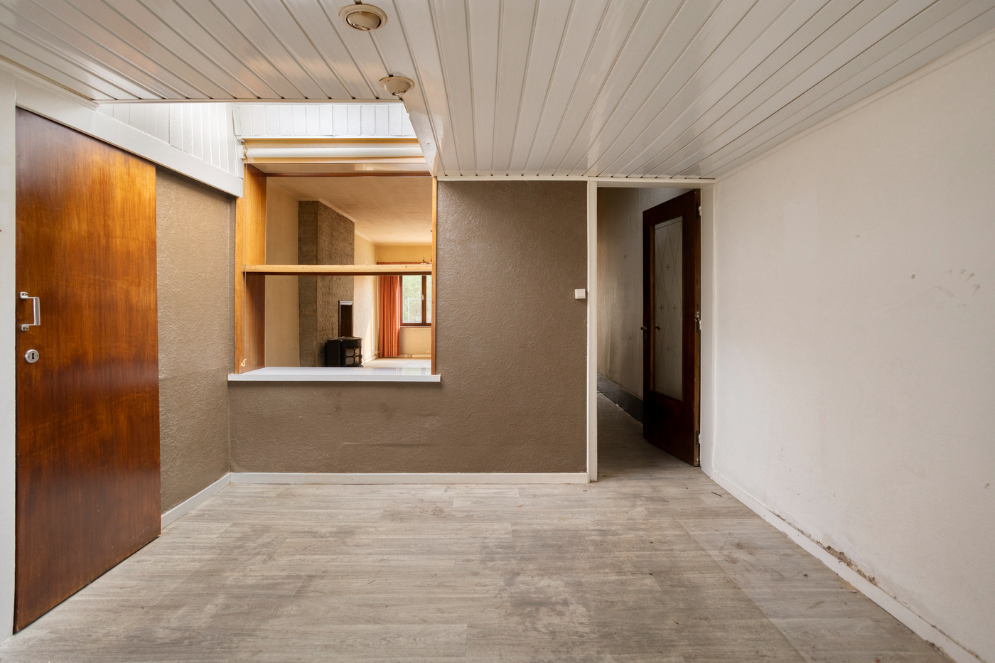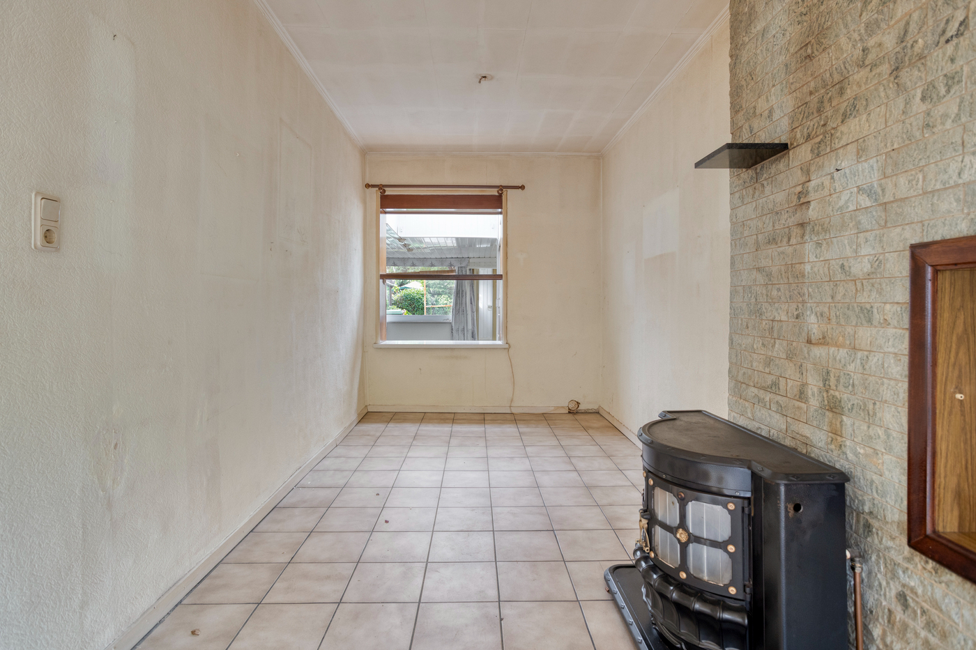 Je betreedt de woning via de inkomhal, nadien de leefruimte met gaskachel, die aansluit op de keuken.