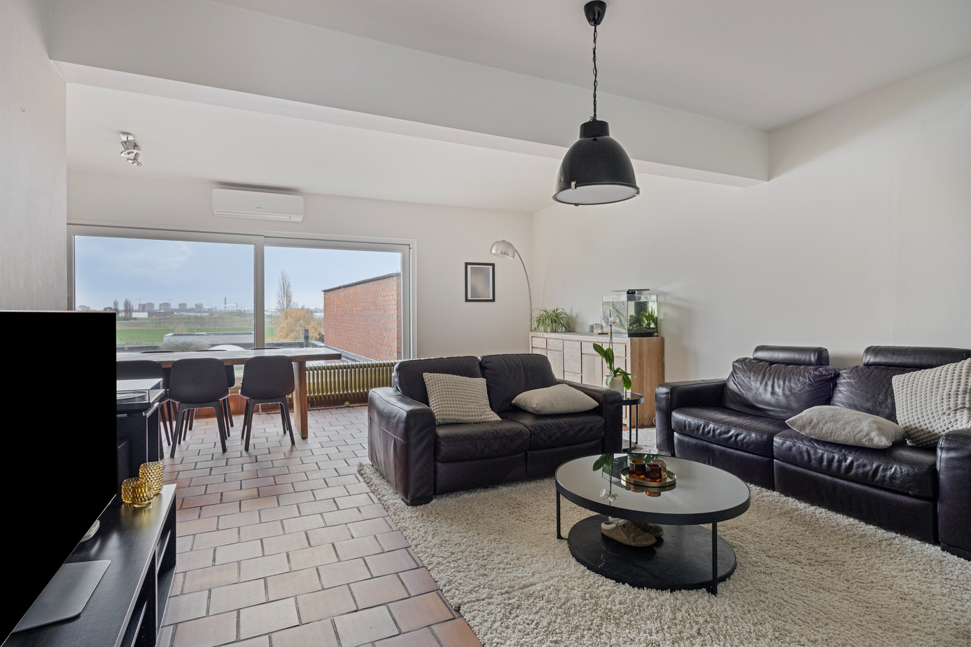 - Links: living met open keuken, badkamer, één slaapkamer en klein terras - EPC: label B: 145 kWh / (m² jaar)