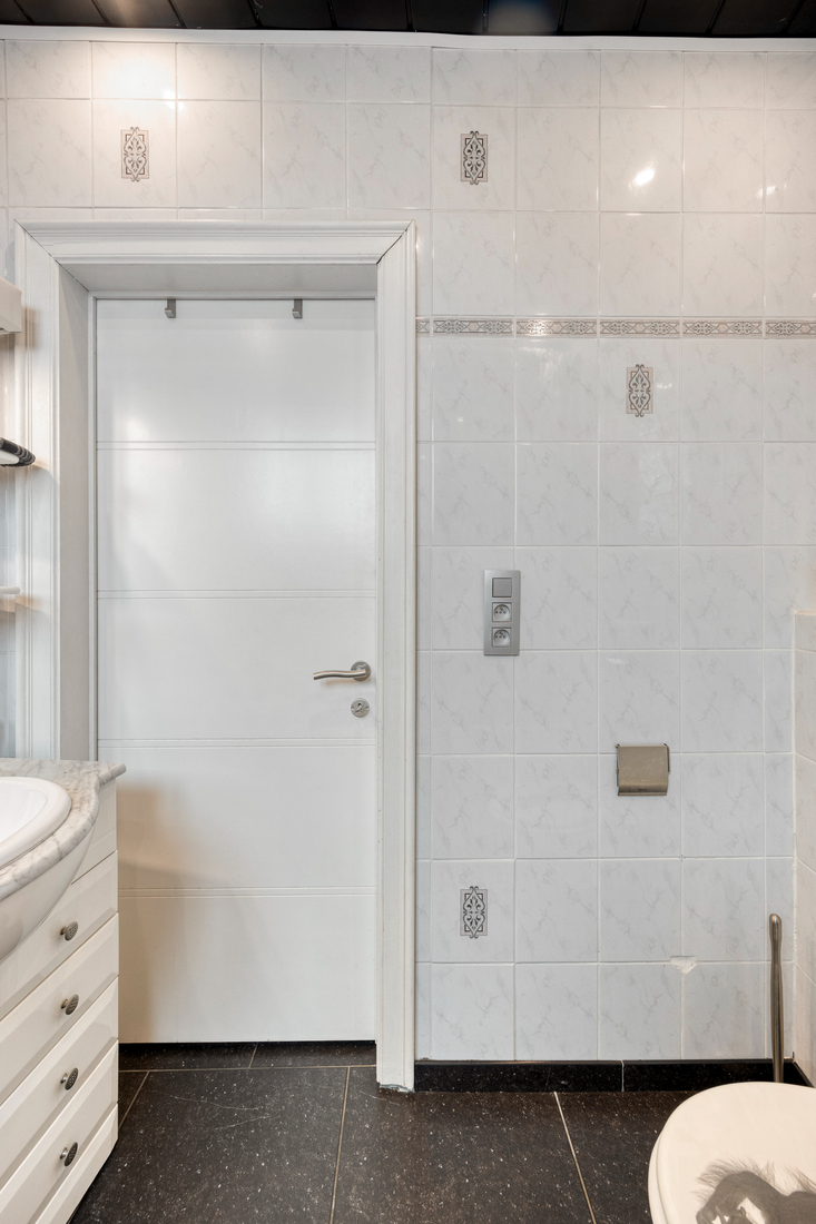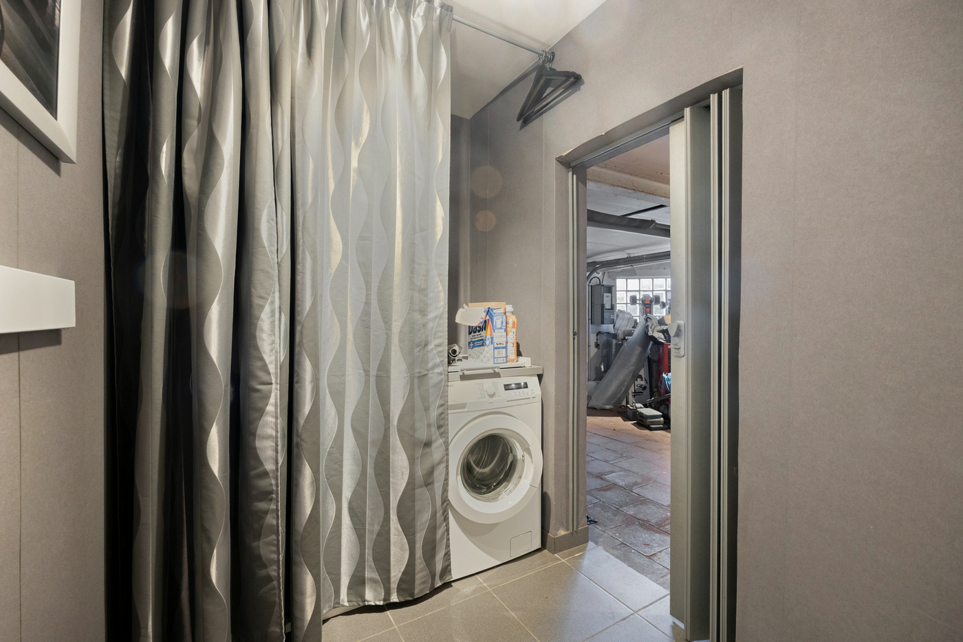 Aansluitend aan de keuken is er een ruime berging met plaats voor wasmachine en extra opslag, die rechtstreeks toegang geeft tot de ruime garage.