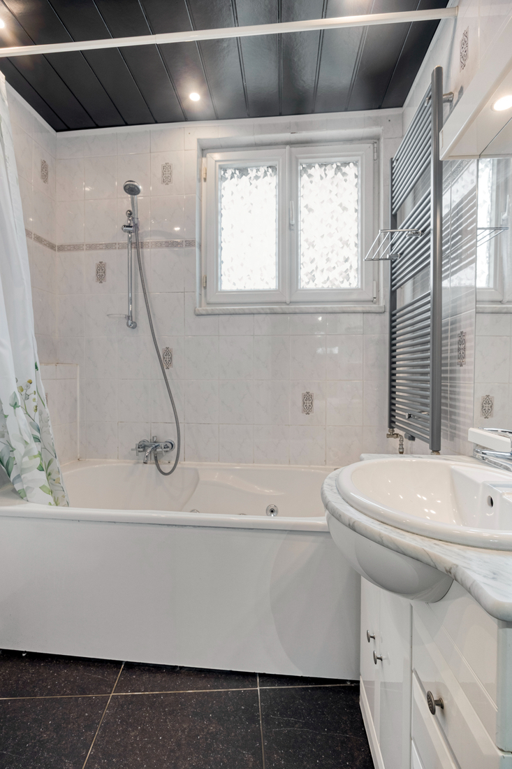 Op het gelijkvloers vinden we verder de badkamer, voorzien van lavabo, ligbad en toilet.