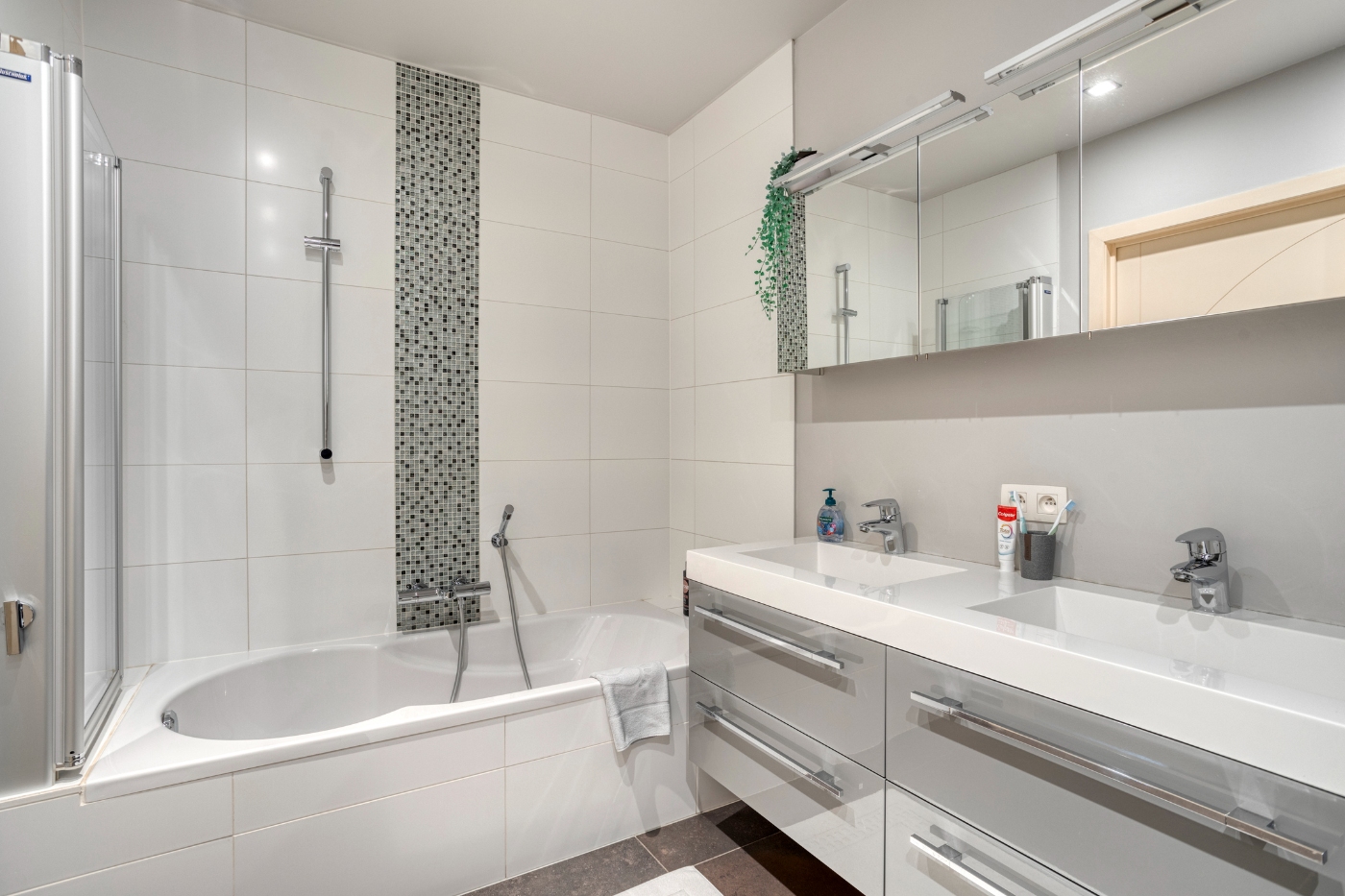 De badkamer is uitgerust met een dubbele lavabo, ligbad met douchemogelijkheid en een tweede toilet.