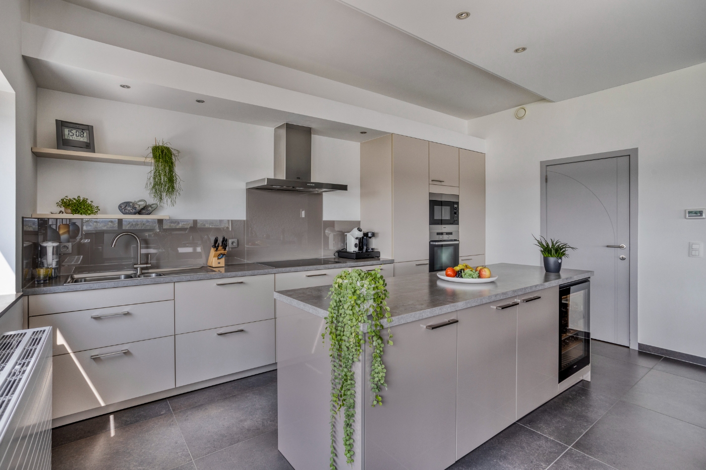 De open, kwalitatieve keuken met keukeneiland is volledig uitgerust en sluit aan op een praktische berging met opbergruimte.