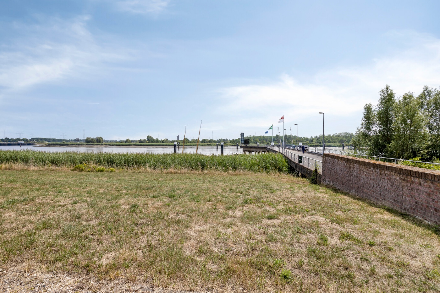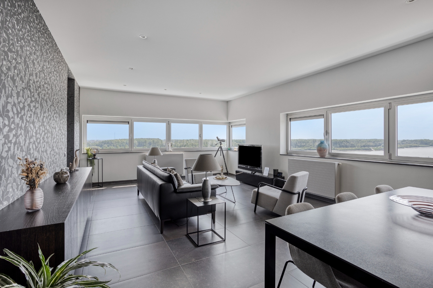 De leefruimte baadt in natuurlijk licht dankzij de raampartijen en biedt een spectaculair zicht op het water en de skyline van Rupelmonde.