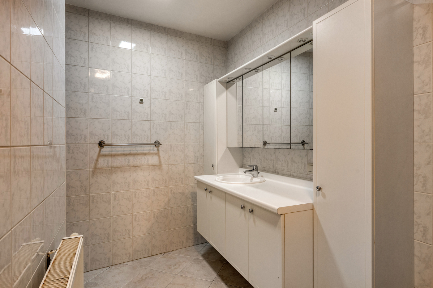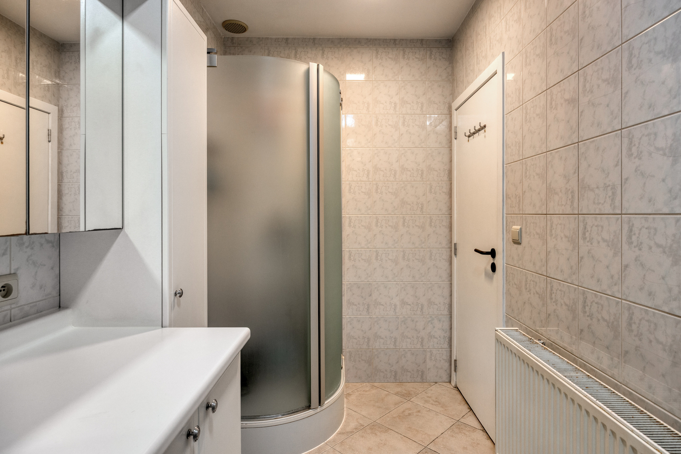 De badkamer is praktisch ingericht en voorzien van lavabomeubel en douche. Toilet apart.