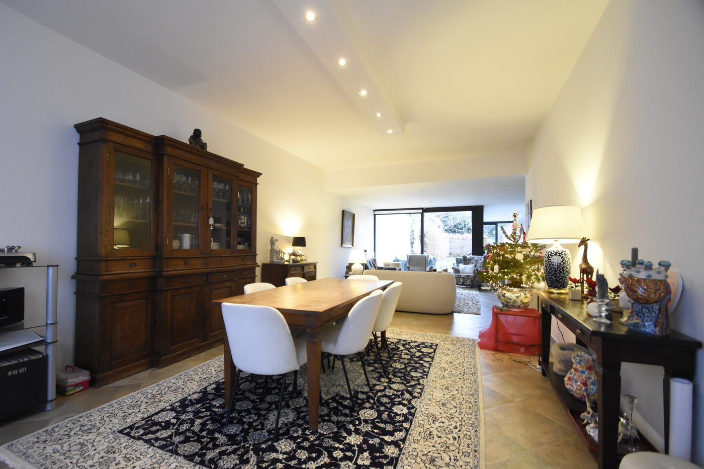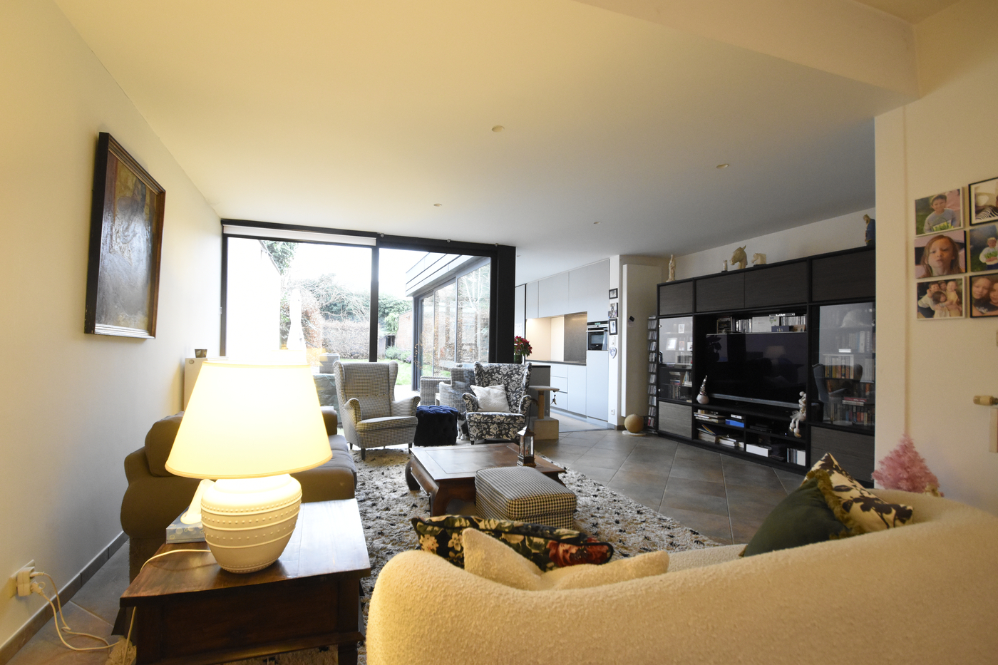 Via de inkomhal kom je terecht in een royale open leefruimte waar eetkamer, living en keuken naadloos in elkaar overlopen.