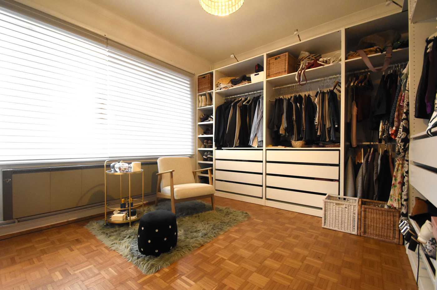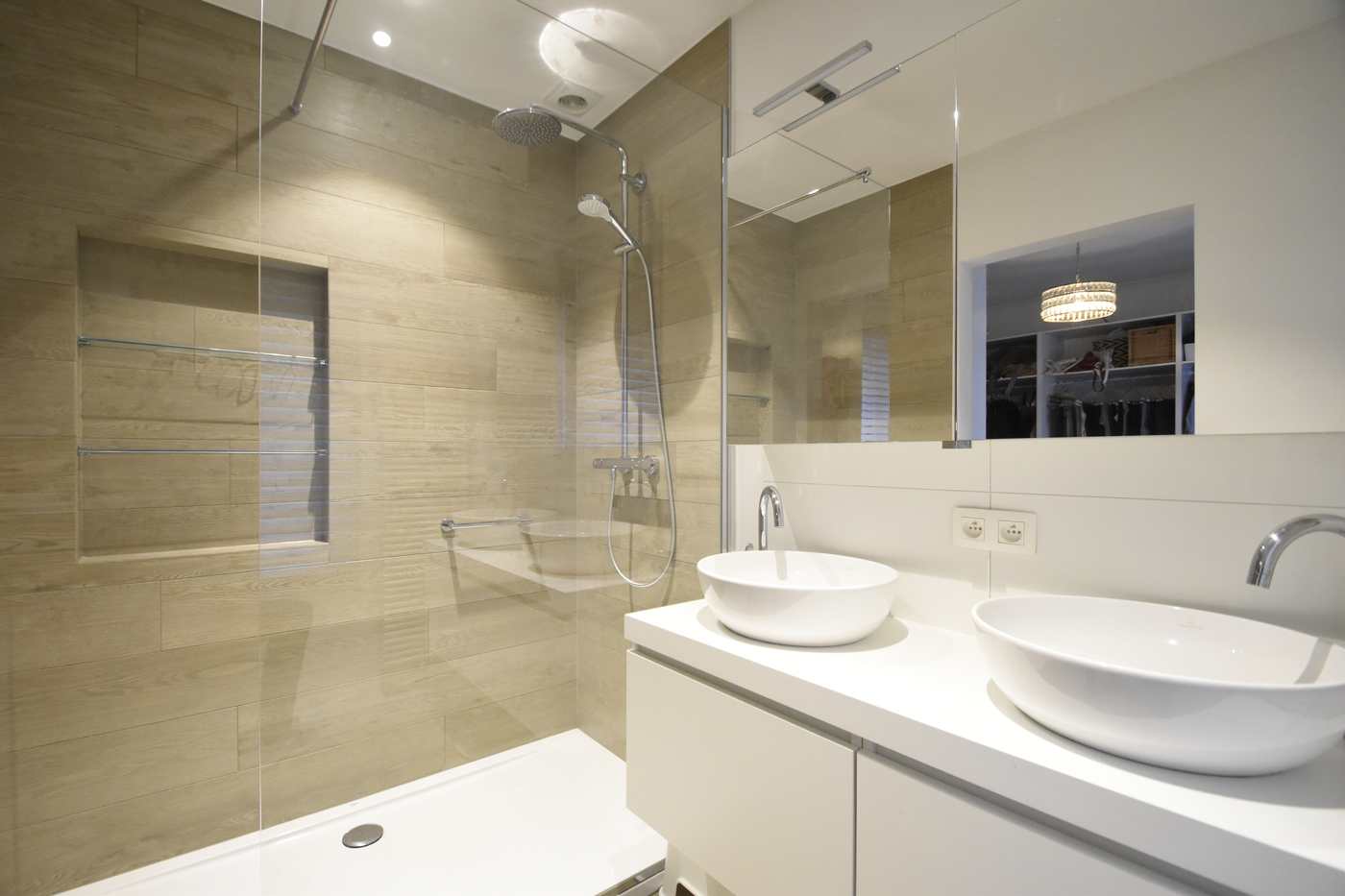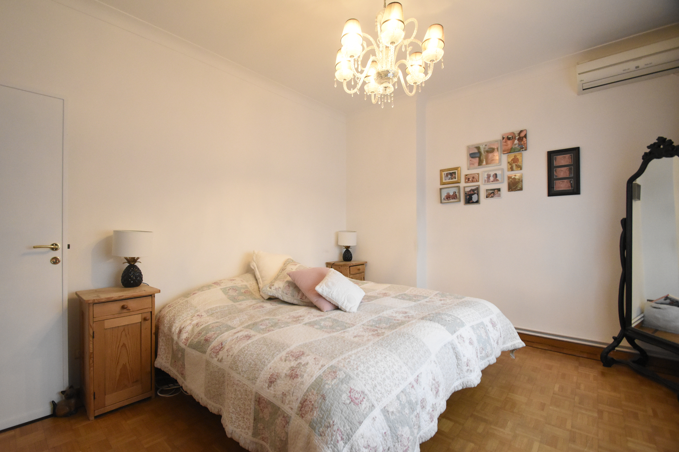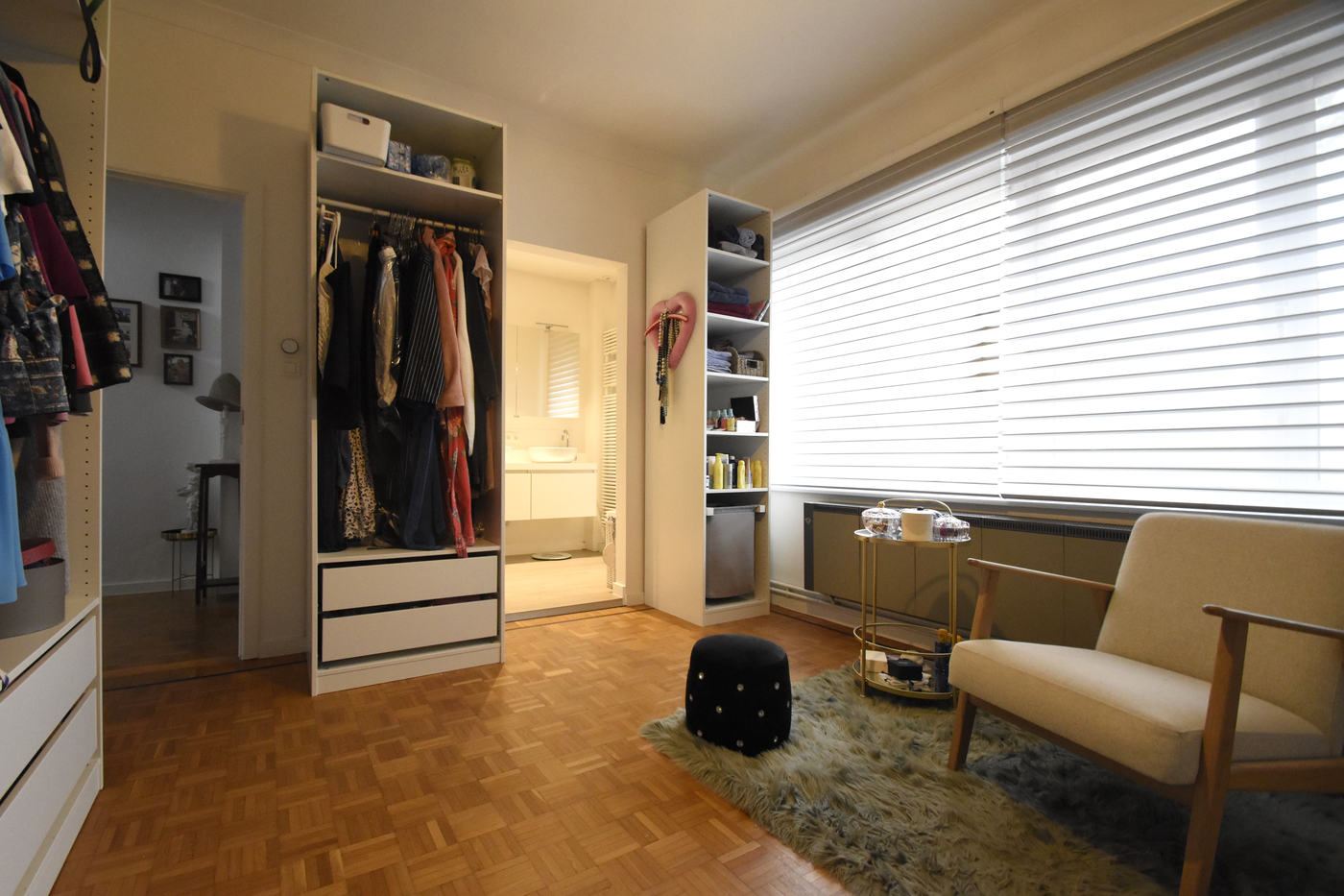 De eerste verdieping is voorzien van de masterbedroom en een tweede kamer die momenteel is ingericht als dressing. Aansluitend bevindt zich de moderne badkamer met dubbele lavabo en inloopdouche.