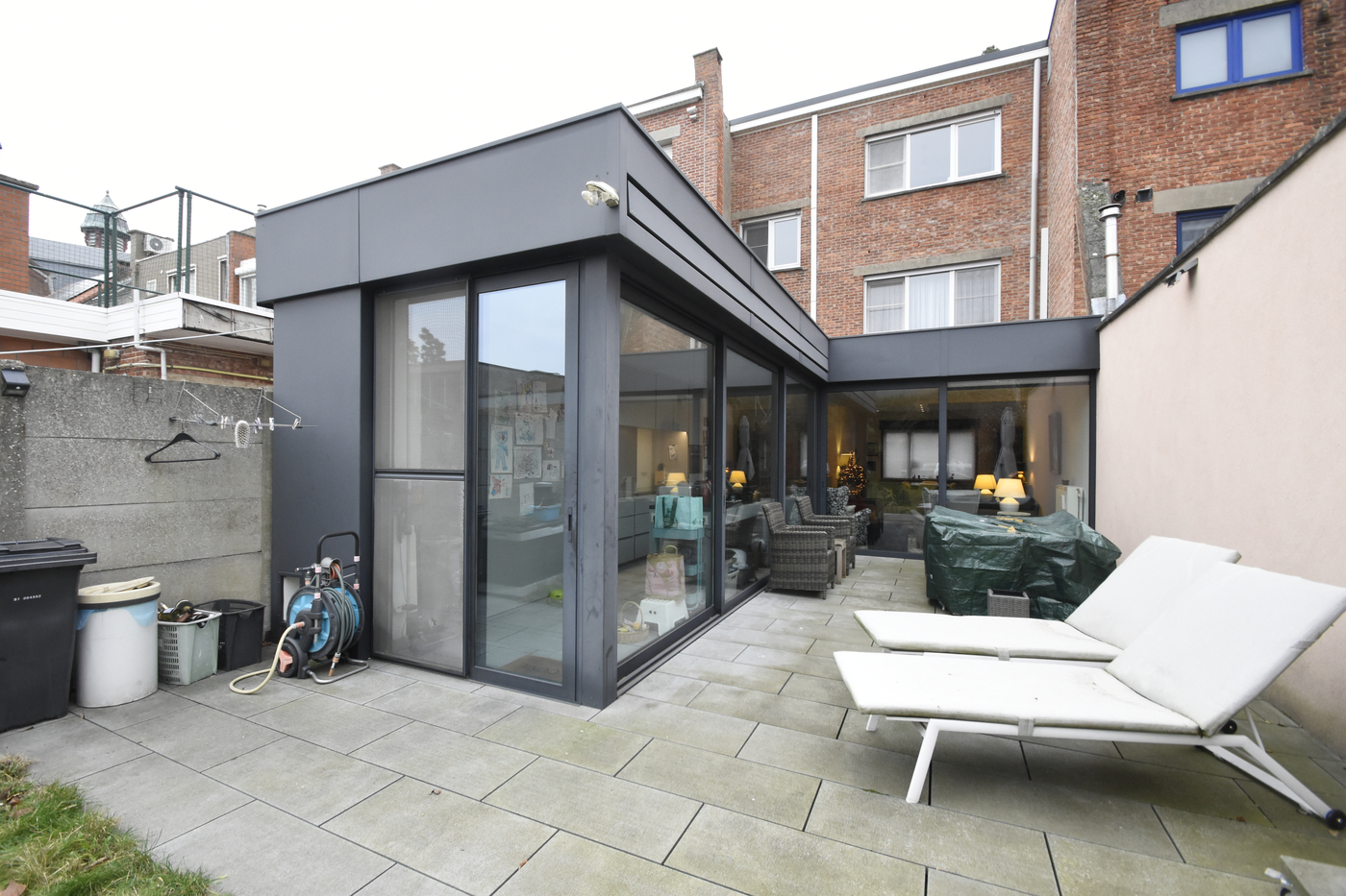 Grote raampartijen en schuiframen aan de achtergevel zorgen voor een overvloed aan natuurlijk licht en een mooi zicht op het terras en de gezellige stadstuin.