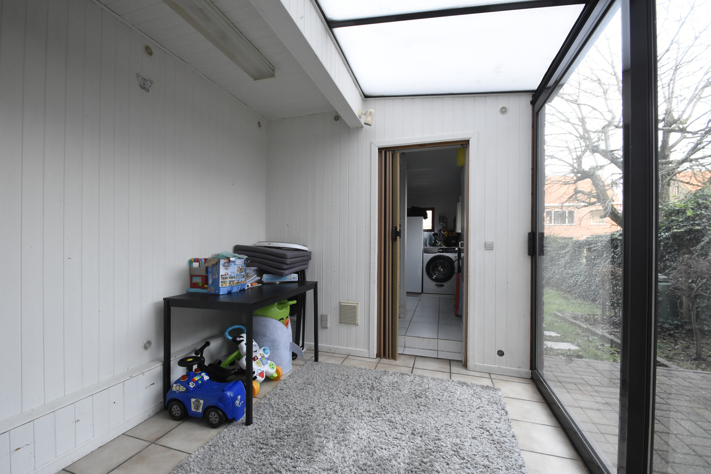 Achteraan bevindt zich een veranda met zicht op de tuin, ideaal als extra leefruimte.
